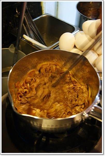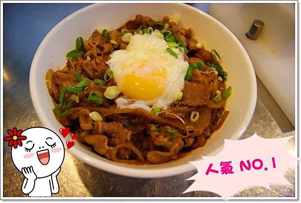 把炒好的牛肉舖在熱騰騰的白飯上,再打上一顆溫泉蛋,台中平價美食人氣NO.1牛肉丼飯完成囉~
