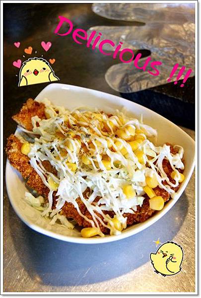 最後撒上玉米粒、高麗菜絲,再用沙拉醬做裝飾,日式炸雞排大功告成ヽ(✿゚▽゚)ノ小編立馬來幫大家品嚐一下,雞排吃起來外酥內軟,雞肉非常多汁,搭配上高麗菜絲跟玉米,吃起來完全不油膩,還有玉米的甜味。