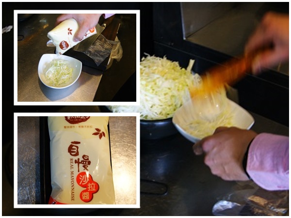 接著當然就是要裝盤囉,首先先舖上一層新鮮的高麗菜,再加上老闆獨家『自慢沙拉醬』
