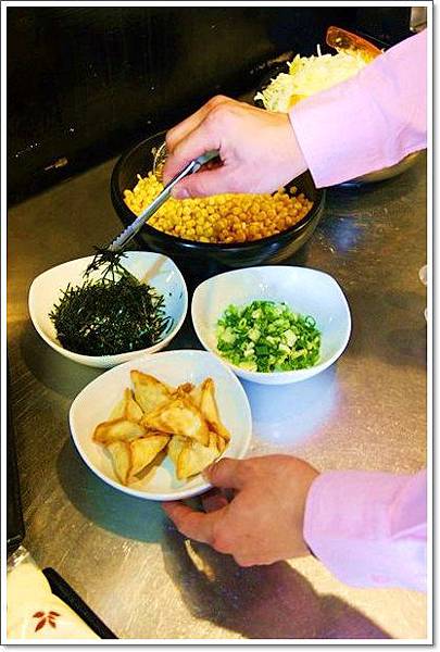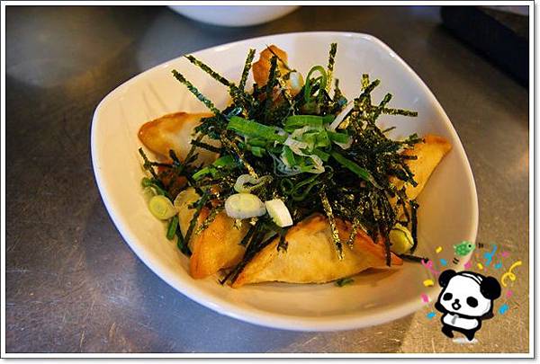 在炸好的餃子燒上,灑上海苔絲與蔥末就完成,可以送到客人面前囉J